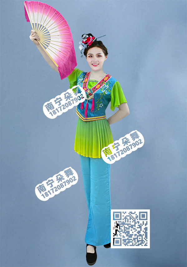 简单描述: 天蓝绣球绿黄渐变彩调裤装